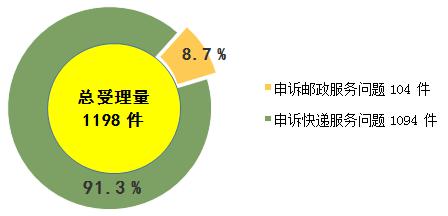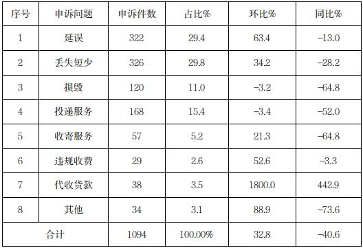用户对快递服务问题申诉1094件,环比上升32.8%,同比下降40.6%。