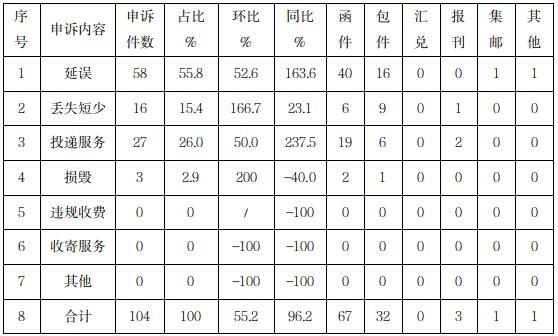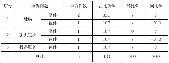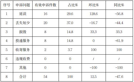 用户对快递服务问题有效申诉54件,环比上升12.5%,同比下降47.6%。快递服务有效申诉的主要问题是快件丢失短少,占有效申诉37.0%,环比下降16.7%,同比下降44.4%;快件延误,占有效申诉29.6%,环比上升128.6%,同比下降56.8%;快件损毁,占有效申诉14.8%,环比上升33.3%,同比上升33.3%;投递服务,占有效申诉14.8%,同比下降61.9%。